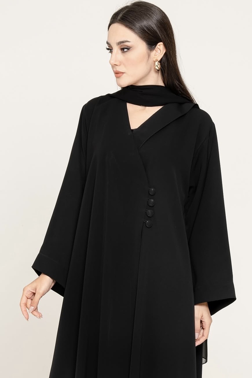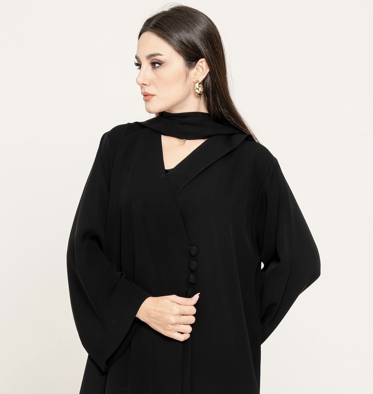 عباية أنيقة ، عملية وفخمة مع ازرار ، تعطي اناقة وذرابة فاللبس وكلوش الخام ندى